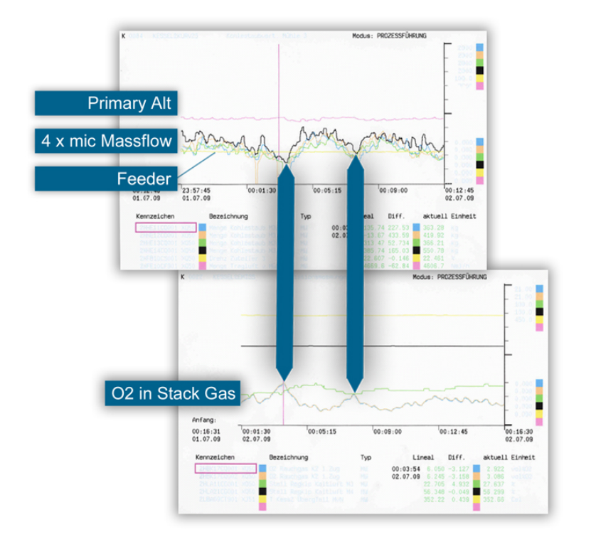 当煤流发生堵塞的情况,通常会对应烟囱气体中的氧气含量变化。